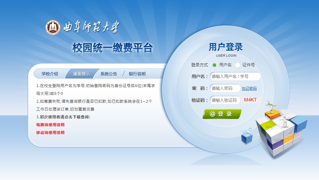 1.按网址打开网页,也可点击炸金花 网址的主页下方的缴费平台,用户名即学号,密码为身份证后六位。