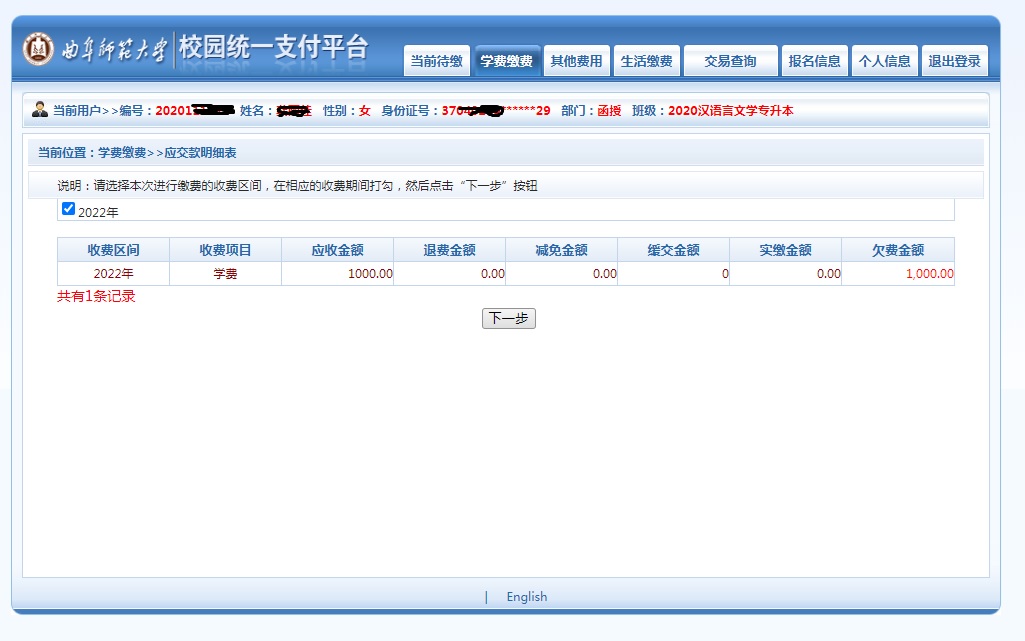 4.点击“学宿费待缴”,按照要求,点击“下一步”。