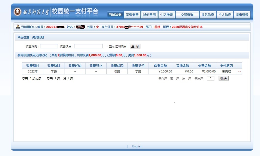 2.输入用户名、密码和验证码后进入校园统一支付平台,显示需缴费金额。