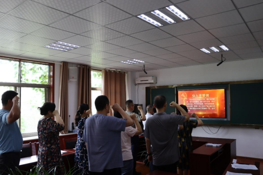 首先,在教工党支部书记马秀峰的带领下,全体党员重温入党誓词。“我志愿加入中国共产党……随时准备为党和人民牺牲一切,永不叛党。” 铿锵有力的誓词,强烈震撼着在场的每一位党员,一字一句,神圣而豪迈,让大家重温了自己加入中国共产党时的庄严承诺,提醒着每位党员要一直不忘初心、努力奋进。