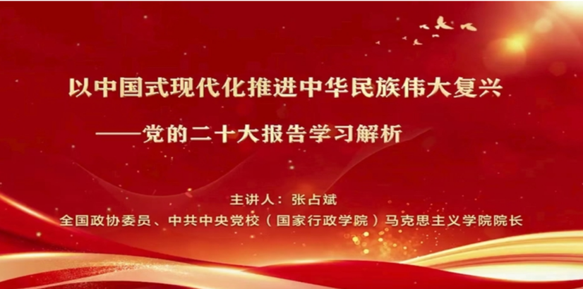 院长张占斌同志讲授,主要从“马克思主义中国化时代化的新境界”“新时代新阶段中国共产党的中心任务”“构建新发展格局,推动经济高质量发展”“在团结奋斗中实现全体人民共同富裕”四个方面对党的二十大报告进行了解析。通过学习,党员们进一步加深了对习近平总书记在党的二十大报告中的重要指示和号召的认识,也深深地感受到中国式现代化的强大力量以及全面建设社会主义现代化国家战略布局的科学性和必然性。