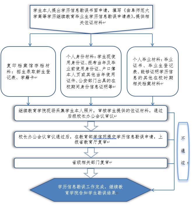 成人高等教育毕业生如学历信息有误可进行勘误,请将有关材料按照要求提交至炸金花 教务部协助进行学历勘误,具体流程如下: