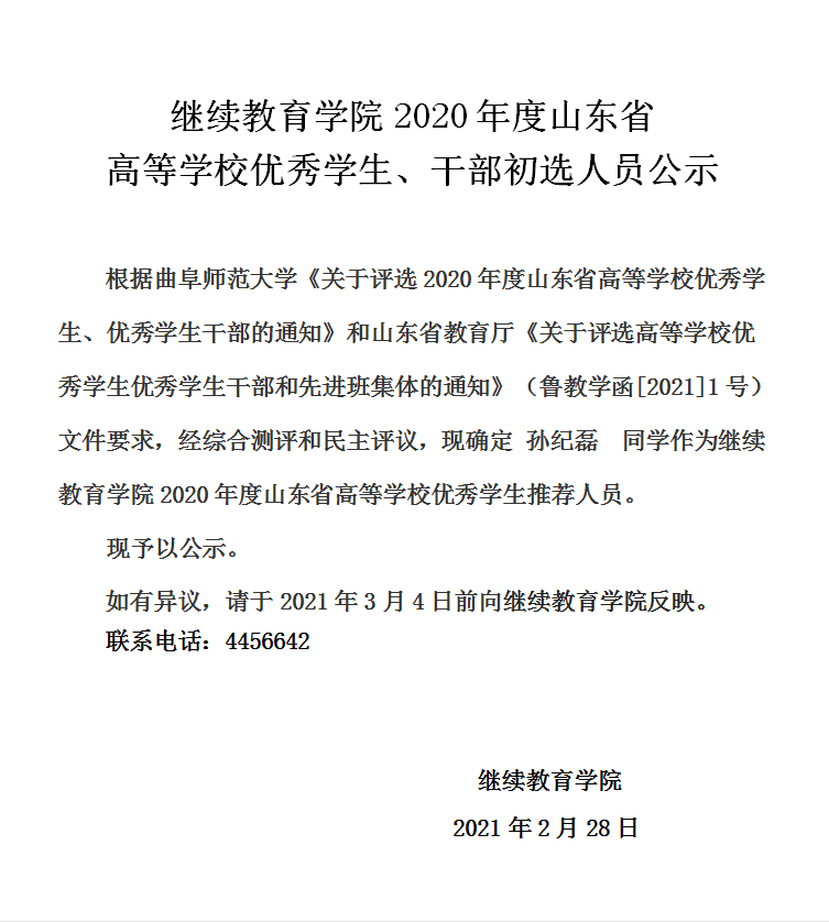 炸金花 2020年度山东省高等学校优秀学生、干部初选人员公示