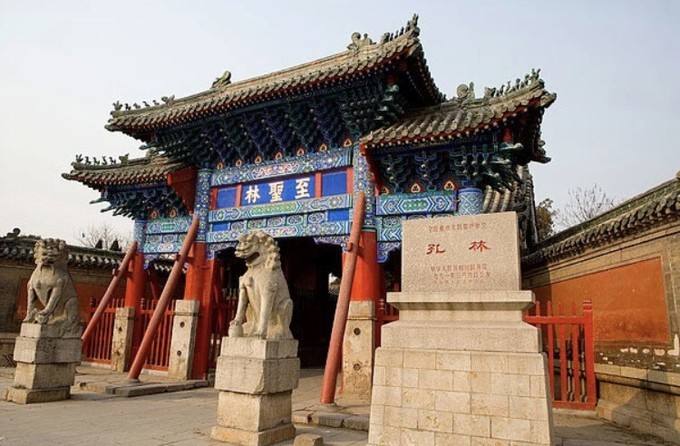 孔林在曲阜市城北约1.5公里处。当初墓地不过一顷,二千四百年来孔子后裔及孔氏族人多埋葬于此,历代帝王又不断赐给祭田、墓田,面积不断扩大,至清雍正八年(1730年)大兴土木,历时三年,建成这座有古树三万余株,占地达三千多亩规模宏大的人造林。其垣墙周长7公里,墙高3.4米,厚约5米。孔林内洙水东西流,水上有洙水桥石坊,桥后享殿五间。最后为东周墓地,绕以红墙,孔子墓位中部,墓东为其子孔鲤墓,南为其孙孔伋墓,这种格局称之谓“携子抱孙”。另有楷亭、驻跸亭、子贡庐墓处等建筑。